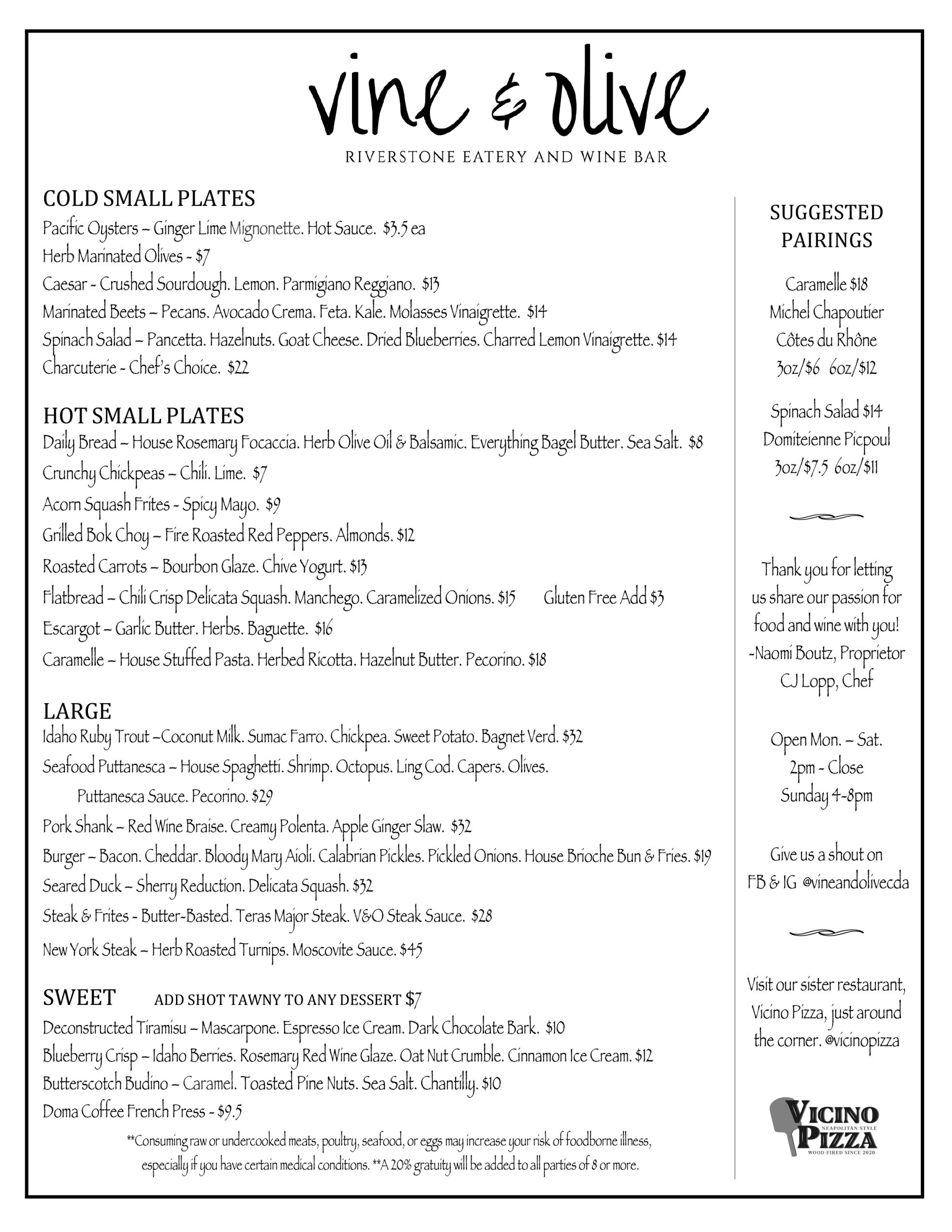 At Vine & Olive, we believe in creating memorable dining experiences beyond the plate. From our restaurant’s signature dishes to our extensive wine selection, each of our menus reflects our passion for exceptional food and drink. Be sure to check back often for seasonal updates and new additions as we continuously evolve our offerings to bring you the best in local, fresh cuisine.